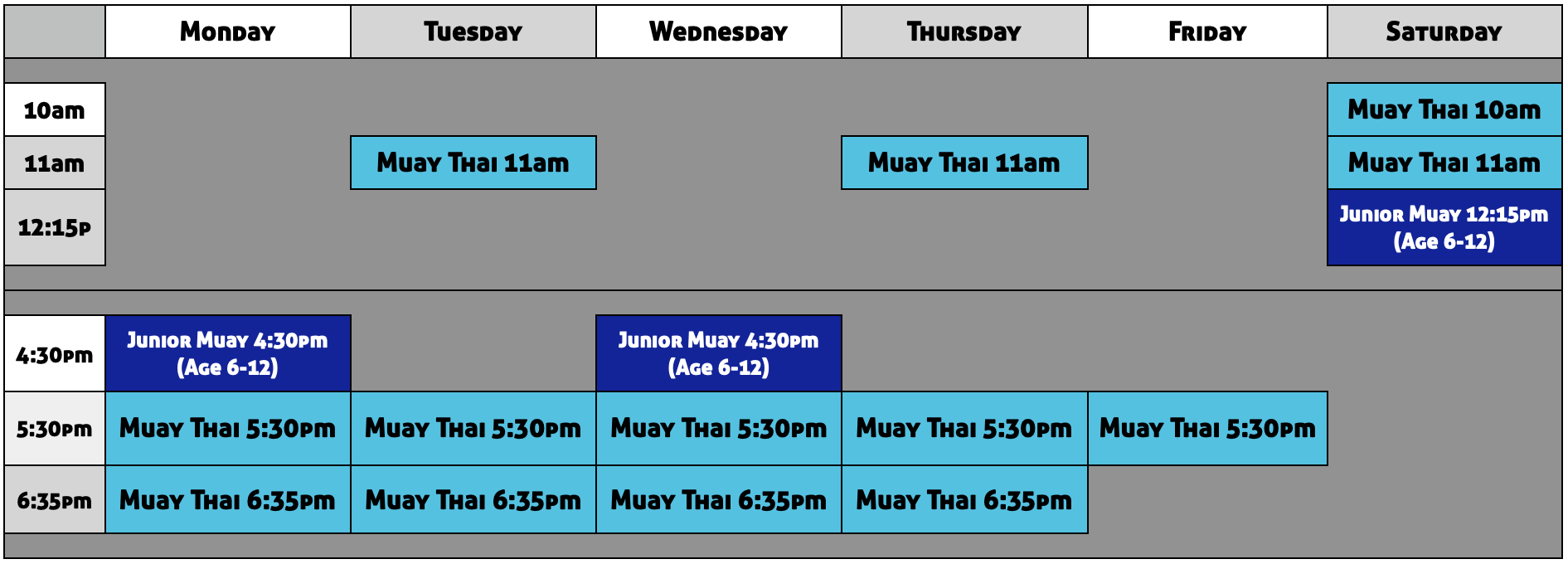 Our youth program, Junior Muay Thai for ages 6-12, is Monday & Wednesday afternoons at 4:30pm and Saturdays at 12:15pm.